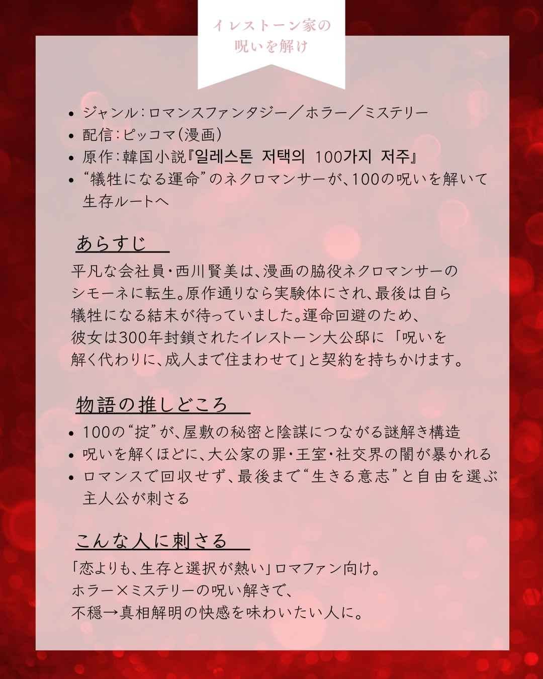 原作タイトルは『일레스톤 저택의 100가지 저주』で、憑依転生したネクロマンサーが「100の呪い」を解いていくホラー×ミステリー要素が強い作品として知られています。